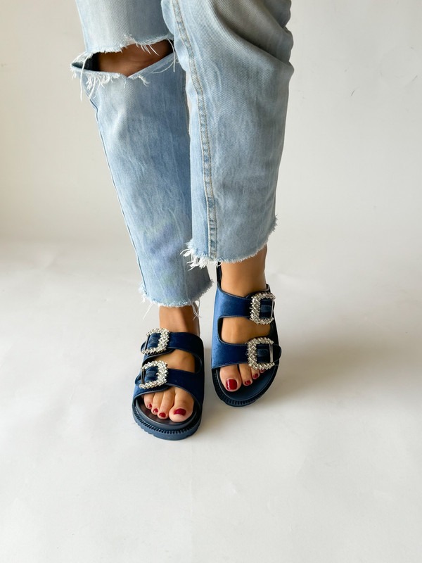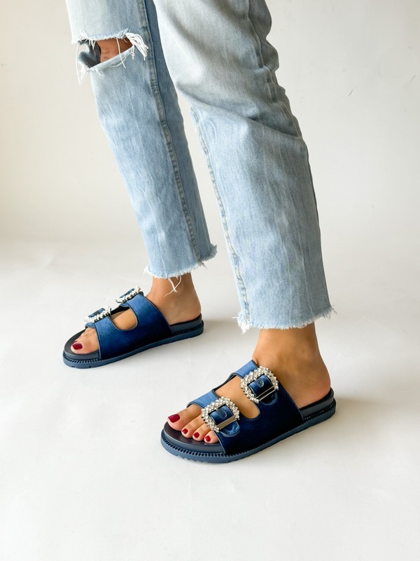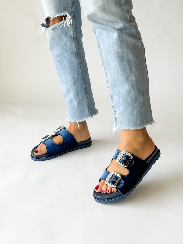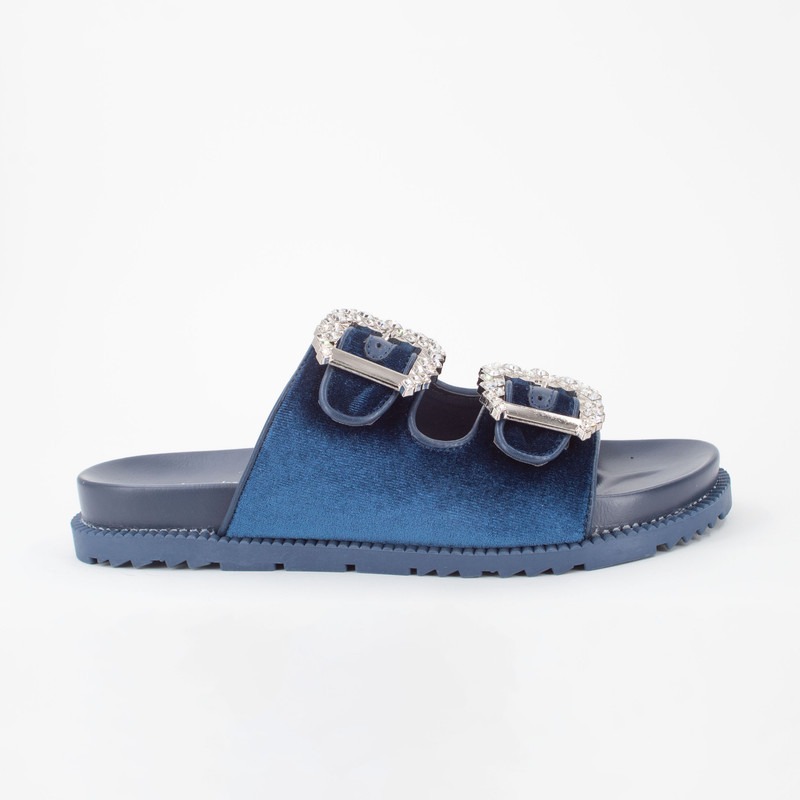 Beaucoup d’élégance et de glamour pour ces jolies sandales plates très chics en velours. Elles sont dotées de boucles incrustées de pierres et sont parfaites pour la journée comme pour le soir si vous êtes de sortie. Elles sont confortables grâce à leur semelle rembourrée. Un must-have!